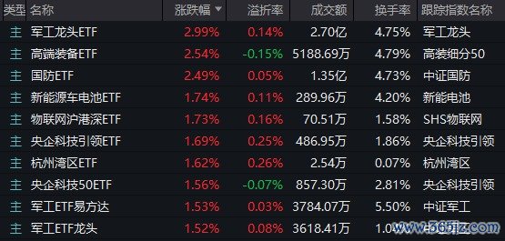 另一边,与A股挂钩的ETF中,军工龙头、高端装备、央企科技等主题产品午后拉升,最终收盘涨幅也保持领先。